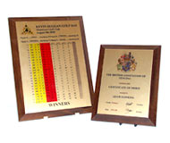 mounted onto plain wood. A foiled plaque has an incorporated silver